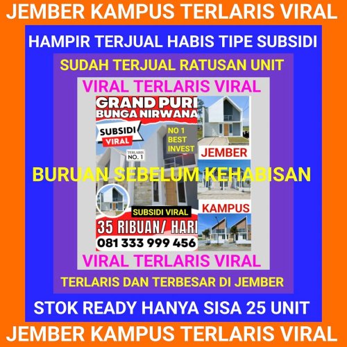 Setelah sukses diserbu pembeli dengan perumahan subsidi minimalis dan terlaris di Wilayah Kampus Jember PURI BUNGA NIRWANA yang telah habis terjual dan terbangun 1000 unit lebih sehingga menjadi perumahan subsidi terbesar di JEMBER.