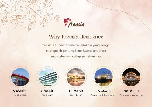 Alamat Lokasi Rumah: Freesia Residence, Kel. Barombong, Kec. Tamalate, Kota Makassar, Sulawesi Selatan. Freesia Residence berada dilokasi strategis di Green River View dengan akses yang mudah menuju Makassar – Gowa.