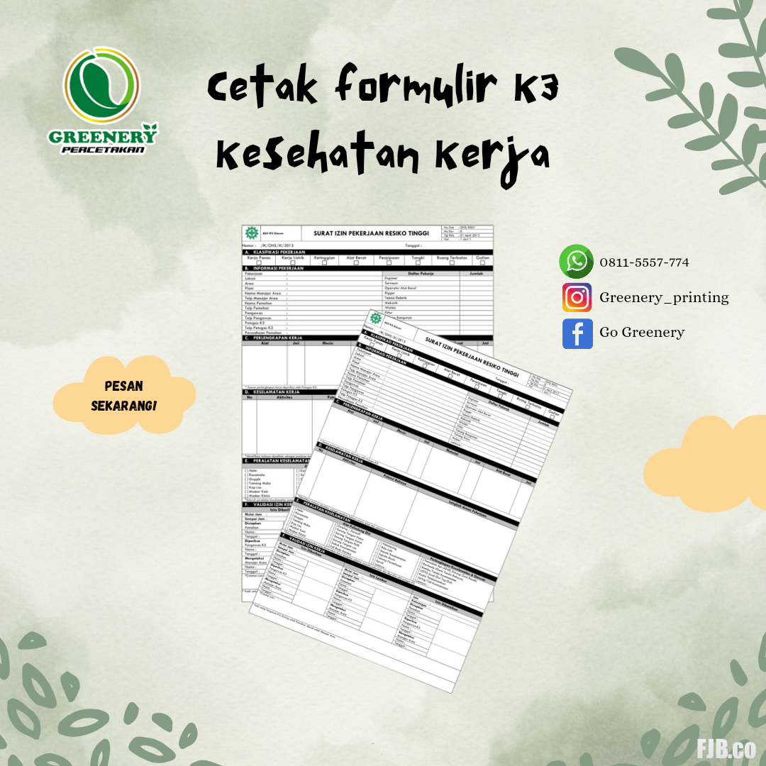 0811 5239 490 (WA) CETAK FORMULIR K3 KESEHATAN KERJA DI SUKAMARA – CV.GREENERY PERCETAKAN SUKAMARA melayani Percetakan CETAK FORMULIR K3 KESEHATAN KERJA DI SUKAMARA yang bisa kami kirimkan ke SUKAMARA. Bagi Anda yang membutuhkan Jasa CETAK FORMULIR K3 KESEHATAN KERJA DI SUKAMARA dalam skala banyak maupun sedang, silahkan Segera Hubungi Tim Kami 0811 5239 490 WA. Formulir K3 (Keselamatan dan Kesehatan Kerja) dapat bervariasi tergantung pada regulasi dan kebijakan di suatu negara atau perusahaan. Umumnya, formulir tersebut mencakup informasi tentang identitas pekerja, riwayat kesehatan, pemeriksaan medis, serta pemahaman dan persetujuan terhadap prosedur keselamatan kerja. Pastikan untuk merujuk pada pedoman resmi atau departemen K3 di wilayah Anda untuk mendapatkan formulir yang tepat. CV. Greenery Percetakan melayani pembelian ke Seluruh Indonesia JNT, LION PARCEL, TIKI, JNE dan berbagai ekspedisi lainnya. KEUNGGULAN FORMULIR K3 KESEHATAN KERJA DI SUKAMARA Keunggulan Cetak Di Greenery: • Terpercaya • Berkualitas • Cepat dan tepat waktu • Harga bersahabat Segera Hubungi CS ADMIN Telp/WA : 0811-5239-490 IG : Greenery Printing