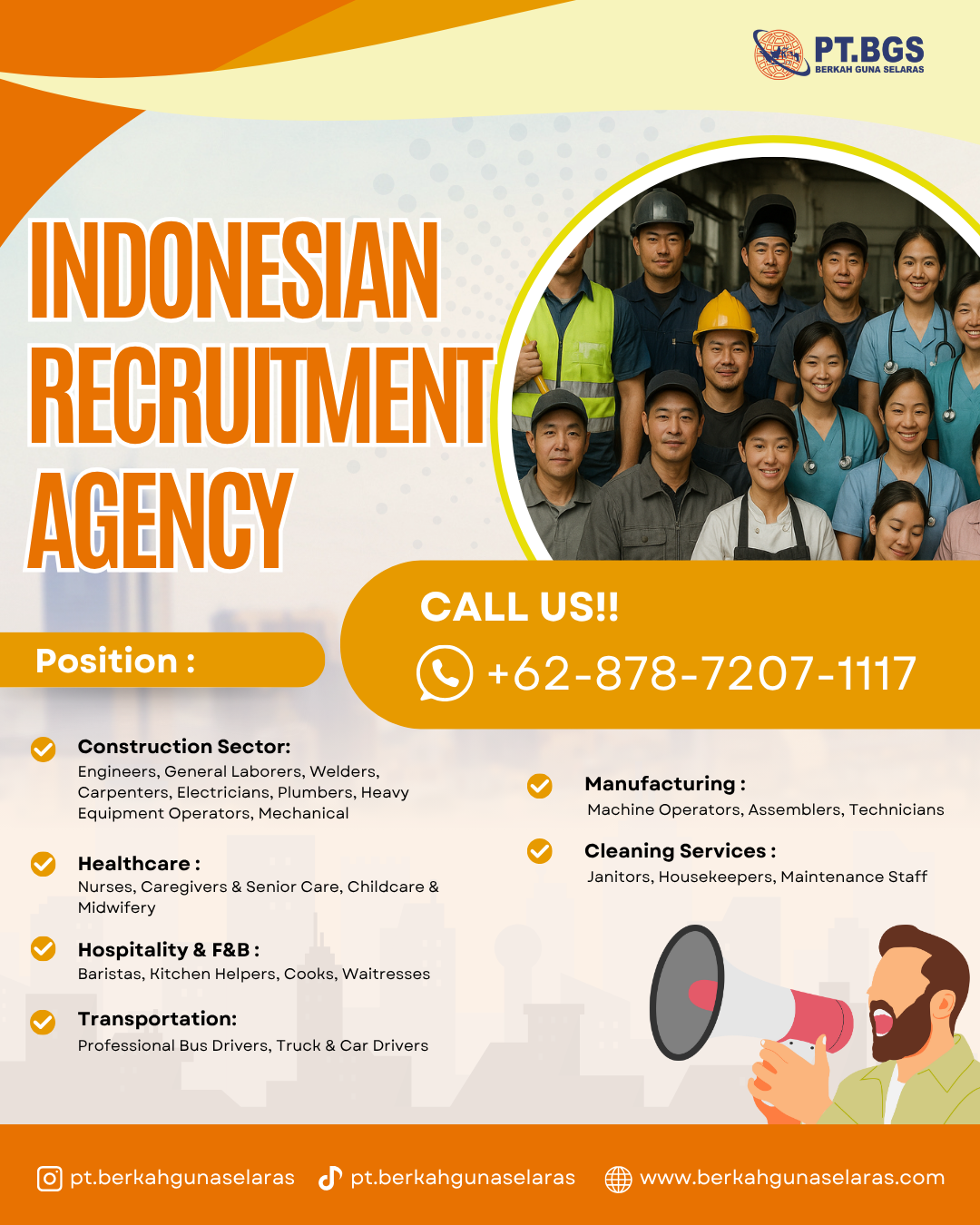 "+62-878-7207-1117 Trusted, Recruitment Office In Indonesia For Abha, Saudi Arabia Call Or Whatsapp Me http://wa.me/6287872071117 , Recruitment Office In Indonesia For Abha, Saudi Arabia, International Recruitment Agencies In Indonesia For Abha, Saudi Arabia, International Labour Agencies In Indonesia For Muscat, Oman, International Labour Supplier In Indonesia For Musandam, Oman, International Labour Company In Indonesia For Al Asimah , Kuwait, International Labour Companies In Indonesia For Hawalli, Kuwait, International Labour Office In Indonesia For Farwaniya, Kuwait, International Workforce Agency In Indonesia For Mubarak Al-Kabeer , Kuwait, International Workforce Agencies In Indonesia For Ahmadi, Kuwait Looking for Reliable, Skilled, and Professional Workers? Choose Indonesia’s Best! We focus on connecting international companies with skilled and experienced Indonesian professionals across a variety of sectors. -Construction Sector: Engineers, General Laborers, Welders, Carpenters, Electricians, Plumbers, Heavy Equipment Operators, Mechanical -Healthcare: Nurses, Caregivers & Senior Care, Childcare & Midwifery -Hospitality & F&B: Baristas, Kitchen Helpers, Cooks, Waitresses -Transportation: Professional Bus Drivers, Truck & Car Drivers -Manufacturing: Machine Operators, Assemblers, Technicians -Cleaning Services: Janitors, Housekeepers, Maintenance Staff Why Choose Indonesian Workers from PT BGS? -Over 19 Years of Global Deployment Experience -Fully Licensed by Indonesia’s Ministry of Manpower -End-to-End Service: Recruitment, Medical, Visa, Deploymen -Trusted by Clients like Samsung, Hyundai, Bahra Cable, Huta Hegerfeld, Vision Etimaad, Saudi Binladin Group and many others -Ready for Large-Scale Partner with us and get manpower solutions tailored to your needs. -Contact Us Today -Website: www.berkahgunaselaras.com -Email: pt.bgs.id@gmail.com -Phone: +62-878-7207-1117 +62-852-8094-4939 Indonesia – Ready to Serve the World #RecruitmentOfficeInIndonesiaForAbha,SaudiArabia, #InternationalRecruitmentAgenciesInIndonesiaForAbhaSaudiArabia, #InternationalLabourAgenciesInIndonesiaForMuscatOman, #InternationalLabourSupplierInIndonesiaForMusandamOman, #InternationalLabourCompanyInIndonesiaForAlAsimahKuwait, #InternationalLabourCompaniesInIndonesiaForHawalliKuwait, #InternationalLabourOfficeInIndonesiaForFarwaniyaKuwait, #InternationalWorkforceAgencyInIndonesiaForMubarakAl-KabeerKuwait, #InternationalWorkforceAgenciesInIndonesiaForAhmadiKuwait"