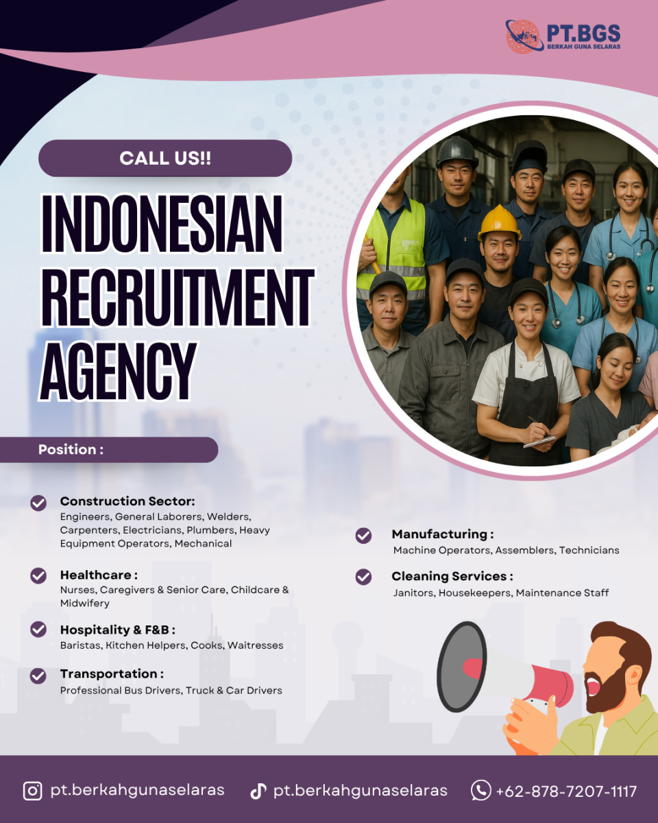 +62-878-7207-1117 Trusted, International Labour Supplier In Indonesia For Musandam, Oman Call Or Whatsapp Me http://wa.me/6287872071117 , International Labour Supplier In Indonesia For Musandam, Oman, Recruiting Companies In Indonesia For Musandam, Oman, International Skilled Worker Companies In Indonesia For Musandam, Oman, International Skilled Worker Office In Indonesia For Al Asimah , Kuwait, International Manpower Agency In Indonesia For Hawalli, Kuwait, International Manpower Agencies In Indonesia For Farwaniya, Kuwait, International Manpower Supplier In Indonesia For Mubarak Al-Kabeer , Kuwait, International Manpower Company In Indonesia For Ahmadi, Kuwait, International Manpower Companies In Indonesia For Jahra, Kuwait Looking for Reliable, Skilled, and Professional Workers? Choose Indonesia’s Best! We focus on connecting international companies with skilled and experienced Indonesian professionals across a variety of sectors. -Construction Sector: Engineers, General Laborers, Welders, Carpenters, Electricians, Plumbers, Heavy Equipment Operators, Mechanical -Healthcare: Nurses, Caregivers & Senior Care, Childcare & Midwifery -Hospitality & F&B: Baristas, Kitchen Helpers, Cooks, Waitresses -Transportation: Professional Bus Drivers, Truck & Car Drivers -Manufacturing: Machine Operators, Assemblers, Technicians -Cleaning Services: Janitors, Housekeepers, Maintenance Staff Why Choose Indonesian Workers from PT BGS? -Over 19 Years of Global Deployment Experience -Fully Licensed by Indonesia’s Ministry of Manpower -End-to-End Service: Recruitment, Medical, Visa, Deploymen -Trusted by Clients like Samsung, Hyundai, Bahra Cable, Huta Hegerfeld, Vision Etimaad, Saudi Binladin Group and many others -Ready for Large-Scale Partner with us and get manpower solutions tailored to your needs. -Contact Us Today -Website: www.berkahgunaselaras.com -Email: pt.bgs.id@gmail.com -Phone: +62-878-7207-1117 +62-852-8094-4939 Indonesia – Ready to Serve the World #InternationalLabourSupplierInIndonesiaForMusandam,Oman, #RecruitingCompaniesInIndonesiaForMusandamOman, #InternationalSkilledWorkerCompaniesInIndonesiaForMusandamOman, #InternationalSkilledWorkerOfficeInIndonesiaForAlAsimahKuwait, #InternationalManpowerAgencyInIndonesiaForHawalliKuwait, #InternationalManpowerAgenciesInIndonesiaForFarwaniyaKuwait, #InternationalManpowerSupplierInIndonesiaForMubarakAl-KabeerKuwait, #InternationalManpowerCompanyInIndonesiaForAhmadiKuwait, #InternationalManpowerCompaniesInIndonesiaForJahraKuwait |