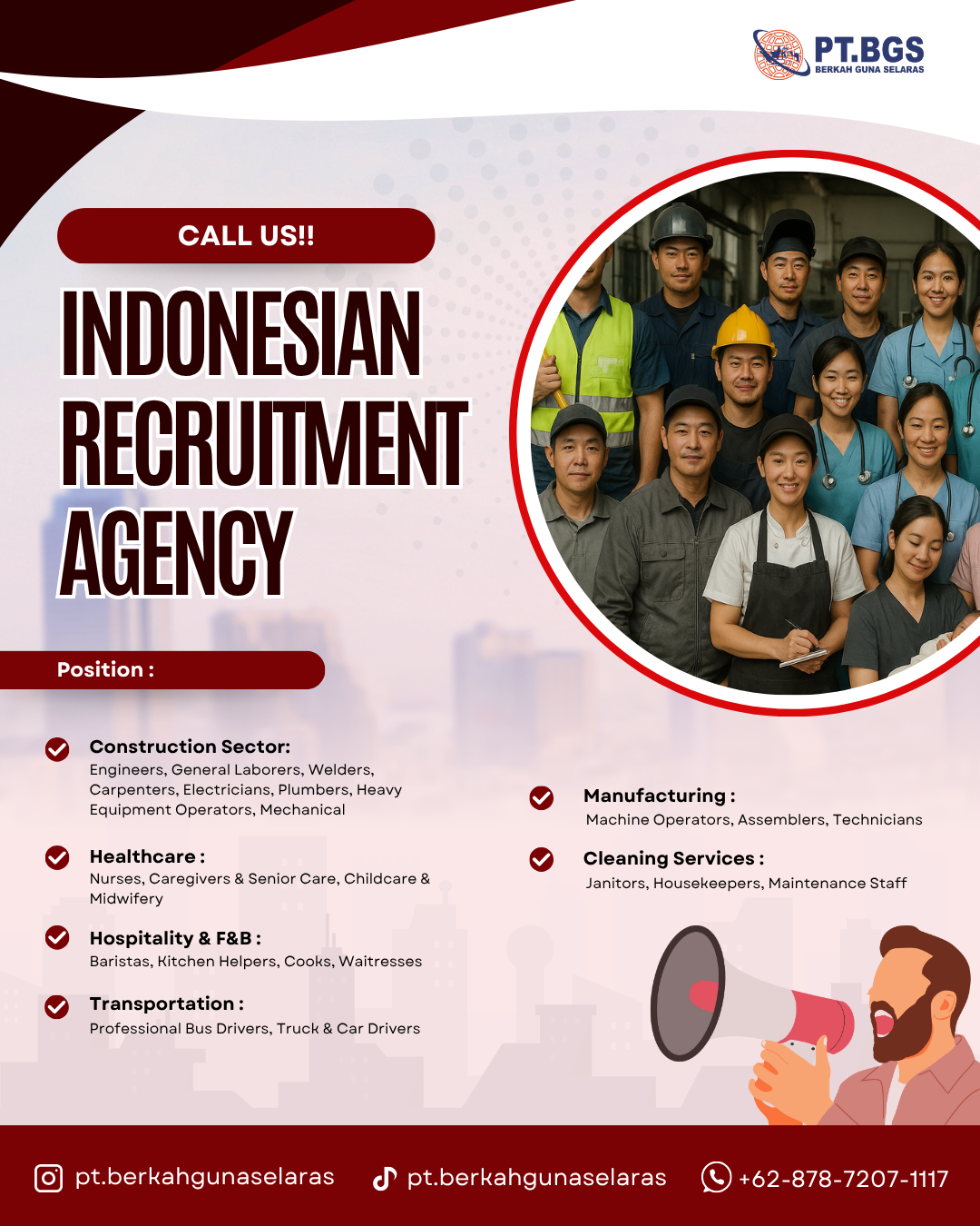 +62-878-7207-1117 Trusted, International Workforce Company In Indonesia For A'ali , Bahrain Call Or Whatsapp Me http://wa.me/6287872071117 , International Workforce Company In Indonesia For A'ali , Bahrain, Legal Staffing Office In Indonesia For A'ali , Bahrain, Recruiting Office In Indonesia For Al Asimah , Kuwait, Legal Staffing Agency In Indonesia For Hawalli, Kuwait, Legal Staffing Agencies In Indonesia For Farwaniya, Kuwait, Legal Staffing Supplier In Indonesia For Mubarak Al-Kabeer , Kuwait, Legal Staffing Company In Indonesia For Ahmadi, Kuwait, Legal Staffing Companies In Indonesia For Jahra, Kuwait, Legal Staffing Office In Indonesia For Dubai, United Emirates Arab Looking for Reliable, Skilled, and Professional Workers? Choose Indonesia’s Best! We focus on connecting international companies with skilled and experienced Indonesian professionals across a variety of sectors. -Construction Sector: Engineers, General Laborers, Welders, Carpenters, Electricians, Plumbers, Heavy Equipment Operators, Mechanical -Healthcare: Nurses, Caregivers & Senior Care, Childcare & Midwifery -Hospitality & F&B: Baristas, Kitchen Helpers, Cooks, Waitresses -Transportation: Professional Bus Drivers, Truck & Car Drivers -Manufacturing: Machine Operators, Assemblers, Technicians -Cleaning Services: Janitors, Housekeepers, Maintenance Staff Why Choose Indonesian Workers from PT BGS? -Over 19 Years of Global Deployment Experience -Fully Licensed by Indonesia’s Ministry of Manpower -End-to-End Service: Recruitment, Medical, Visa, Deploymen -Trusted by Clients like Samsung, Hyundai, Bahra Cable, Huta Hegerfeld, Vision Etimaad, Saudi Binladin Group and many others -Ready for Large-Scale Partner with us and get manpower solutions tailored to your needs. -Contact Us Today -Website: www.berkahgunaselaras.com -Email: pt.bgs.id@gmail.com -Phone: +62-878-7207-1117 +62-852-8094-4939 Indonesia – Ready to Serve the World #InternationalWorkforceCompanyInIndonesiaForA'ali ,Bahrain, #LegalStaffingOfficeInIndonesiaForA'ali Bahrain, #RecruitingOfficeInIndonesiaForAlAsimahKuwait, #LegalStaffingAgencyInIndonesiaForHawalliKuwait, #LegalStaffingAgenciesInIndonesiaForFarwaniyaKuwait, #LegalStaffingSupplierInIndonesiaForMubarakAl-KabeerKuwait, #LegalStaffingCompanyInIndonesiaForAhmadiKuwait, #LegalStaffingCompaniesInIndonesiaForJahraKuwait, #LegalStaffingOfficeInIndonesiaForDubaiUnitedEmiratesArab