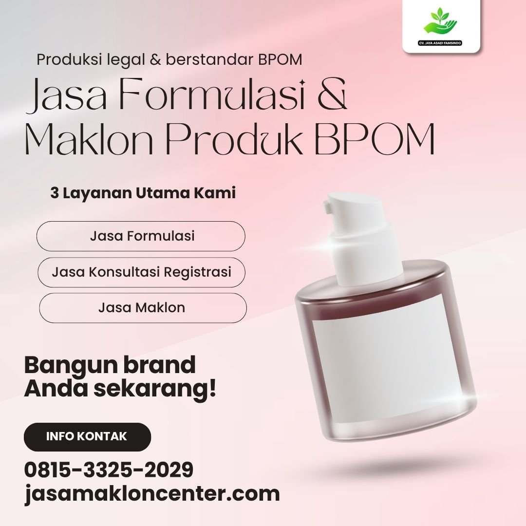 "KLIK https://wa.me/6281533252029, jasa formulasi produk herbal, jasa maklon BPOM, jasa maklon kosmetik, jasa registrasi PIRT NA MD TR SD, jasa maklon suplemen Memulai brand baru di industri kesehatan dan kecantikan sering kali terasa rumit. Anda memiliki ide produk herbal, suplemen, kosmetik, atau skincare, tetapi bingung dari mana memulai formulasi, produksi, hingga izin edar. CV. Jaya Abadi Famsindo hadir sebagai solusi lengkap, membantu UMKM dan brand baru menjalankan bisnis dengan cara yang lebih terstruktur, efisien, dan aman. # Langkah 1: Tentukan Jenis Produk dan Target Pasar Sebelum memulai, tentukan jenis produk yang ingin dibuat: herbal, suplemen, minuman kesehatan, kosmetik, atau skincare. Pahami target pasar, apakah untuk konsumen lokal, online, atau ritel modern. Mengetahui target pasar akan membantu menentukan formula dan jenis kemasan yang tepat. # Langkah 2: Formulasi Produk Profesional Setelah menentukan jenis produk, langkah berikutnya adalah formulasi. Tim ahli CV. Jaya Abadi Famsindo membantu meracik formula produk yang: - Aman dikonsumsi atau digunakan, sesuai standar BPOM. - Memiliki kualitas tinggi dan efektif. - Disesuaikan dengan tren dan preferensi konsumen. Produk yang dapat diformulasikan antara lain: kapsul herbal, suplemen tablet, minuman herbal dan botanical, krim, lotion, serta kosmetik dekoratif. # Langkah 3: Pilih Sistem Maklon Setelah formula siap, produksi dapat dilakukan melalui jasa maklon. Maklon memungkinkan UMKM atau brand baru memproduksi produk tanpa fasilitas pabrik sendiri. Produk bisa menggunakan brand Anda sendiri (private label). Keuntungan maklon termasuk: - Fleksibilitas batch kecil hingga besar. - Produksi sesuai standar BPOM. - Pengurangan risiko investasi modal besar. # Langkah 4: Registrasi Produk Resmi Agar produk bisa diedarkan secara legal, registrasi PIRT, NA, MD, TR, dan SD wajib dilakukan. CV. Jaya Abadi Famsindo membantu pengurusan izin, termasuk dokumen dan prosedur, agar: - Produk memiliki izin edar sah. - Konsumen merasa aman dan percaya. - Bisnis bisa berkembang dengan cepat tanpa kendala legalitas. # Tips Praktis untuk Brand Baru 1. Mulai dari batch kecil untuk menguji pasar sebelum produksi massal. 2. Gunakan private label agar brand lebih dikenal. 3. Konsultasikan formulasi dengan ahli untuk memastikan kualitas. 4. Pastikan legalitas lengkap agar mudah masuk marketplace dan toko. 5. Fokus pada strategi pemasaran sambil tim profesional menangani produksi dan registrasi. Siap memulai brand produk kesehatan atau kecantikan dengan mudah dan aman? Konsultasi gratis bersama CV. Jaya Abadi Famsindo sekarang juga! Kontak Resmi: WhatsApp: https://wa.me/6281533252029 Website: https://jasamakloncenter.com Jasa Pembuatan Skincare Untuk Umkm Tasikmalaya, Jasa Formulasi Minuman Cimahi, Jasa Formulasi Nutrisi Cirebon, Jasa Formulasi Obat Tasikmalaya, Jasa Formulasi Obat Herbal Sukabumi, Jasa Formulasi Parfum Semarang, Jasa Formulasi Produk Solo, Jasa Formulasi Tablet Magelang #JasaPembuatanSkincareUntukUmkmTasikmalaya, #JasaFormulasiMinumanCimahi, #JasaFormulasiNutrisiCirebon, #JasaFormulasiObatTasikmalaya, #JasaFormulasiObatHerbalSukabumi, #JasaFormulasiParfumSemarang, #JasaFormulasiProdukSolo, #JasaFormulasiTabletMagelang"