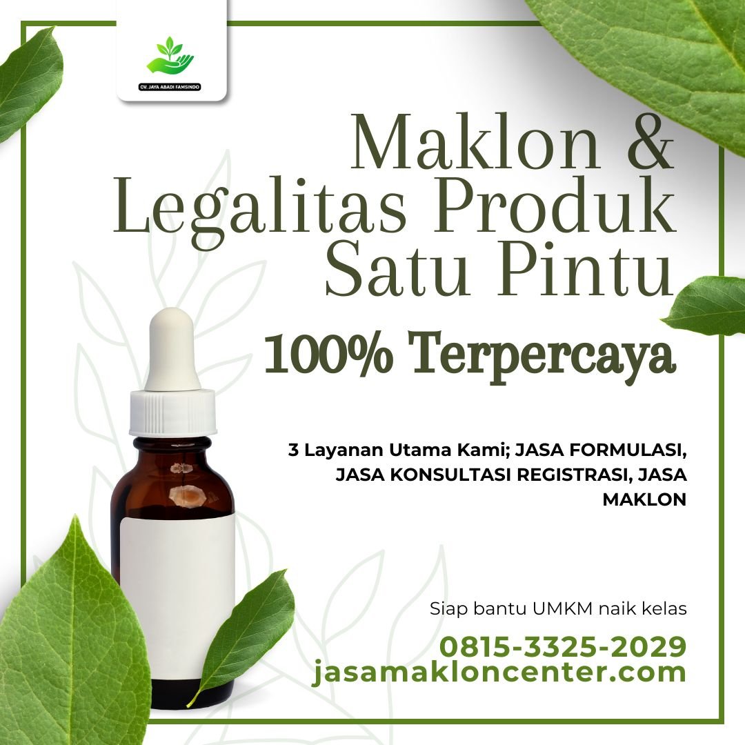 KLIK https://wa.me/6281533252029, jasa maklon BPOM, jasa maklon kosmetik, jasa maklon suplemen, jasa formulasi produk herbal, jasa registrasi PIRT NA MD TR SD CV. Jaya Abadi Famsindo menyediakan layanan jasa maklon dan private label untuk produk herbal, kosmetik, dan suplemen yang cocok untuk UMKM dan brand baru. Layanan kami memudahkan pelaku usaha memiliki produk berkualitas dengan legalitas BPOM resmi tanpa harus membangun fasilitas produksi sendiri. # Layanan Maklon Produk Kami melayani maklon untuk berbagai jenis produk: - Herbal dan suplemen: kapsul, tablet, cair, serbuk, dan effervescent. - Minuman kesehatan: teh herbal, madu herbal, minuman botanical, minuman serbuk. - Skincare & bodycare: krim, lotion, serum, masker, sabun, dan body wash. - Kosmetik dekoratif: lipstik, bedak, blush on, foundation, dan produk makeup lainnya. Produk maklon dapat menggunakan brand Anda sendiri (private label), sehingga tampak profesional dan siap dipasarkan di pasaran lokal maupun online. # Keunggulan Jasa Maklon dan Private Label 1. Produksi Profesional – Standar BPOM untuk keamanan dan kualitas. 2. Batch Fleksibel – Bisa mulai dari batch kecil, ideal untuk UMKM. 3. Private Label – Produk bisa memakai brand sendiri. 4. Efisiensi Waktu dan Biaya – Tidak perlu membangun fasilitas produksi sendiri. 5. Pendampingan Penuh – Tim ahli membantu dari formulasi, produksi, hingga siap edar. Dengan layanan maklon, UMKM dan brand baru bisa lebih fokus membangun identitas brand, strategi pemasaran, dan penjualan, sementara seluruh proses produksi berjalan profesional dan aman. # Dukungan Formulasi dan Registrasi Selain maklon, kami juga menyediakan jasa formulasi produk herbal, kosmetik, dan suplemen agar formula produk sesuai standar dan sesuai tren pasar. Kami juga melayani jasa registrasi PIRT, NA, MD, TR, SD sehingga produk yang dipasarkan memiliki legalitas resmi BPOM dan aman untuk konsumen. Ingin memulai produk herbal, kosmetik, atau suplemen dengan brand sendiri? Konsultasi gratis sekarang bersama CV. Jaya Abadi Famsindo! Kontak Resmi: WhatsApp: https://wa.me/6281533252029 Website: https://jasamakloncenter.com Jasa Pembuatan Suplemen Olahraga (Fitness) NTT, Jasa Formulasi Obat Mojokerto, Jasa Maklon Produk NTB, Jasa Maklon Roti NTT, Jasa Maklon Minuman Ready To Drink Maluku, Jasa Maklon Snack Maluku Utara, Jasa Maklon Sambal Papua Barat, Jasa Makion Sabun Papua, Jasa Makion Skincare Terbaik Jakarta Pusat #JasaPembuatanSuplemenOlahraga(Fitness)NTT, #JasaFormulasiObatMojokerto, #JasaMaklonProdukNTB, #JasaMaklonRotiNTT, #JasaMaklonMinumanReadyToDrinkMaluku, #JasaMaklonSnackMalukuUtara, #JasaMaklonSambalPapuaBarat, #JasaMakionSabunPapua, #JasaMakionSkincareTerbaikJakartaPusat