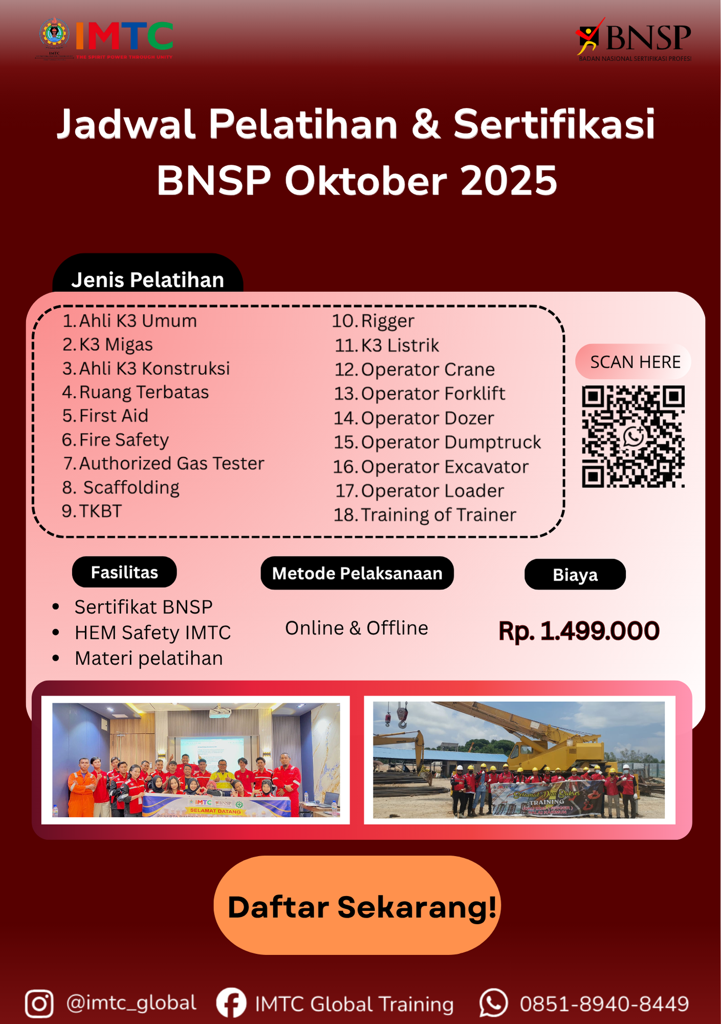 "Langsung pesan via WA di sini! https://wa.me/6281266295335, Sertifikasi Operator K3 Umum Palopo,Sertifikasi Petugas K3 Kimia Parepare,Sertifikasi Petugas K3 Sidrap,Sertifikasi Petugas K3 Bnsp Pinrang,Sertifikasi Petugas K3 Listrik Enrekang,Pelatihan K3 Gowa,Sertifikasi Petugas K3 Penyelamat Ruang Terbatas Takalar,Sertifikasi Petugas K3 Ruang Terbatas Bulukumba Pelatihan & Sertifikasi Operator K3 Umum – BNSP / Kemnaker Tingkatkan Kompetensi & Raih Sertifikat Resmi Operator K3 Umum untuk Karier Lebih Profesional! Apakah Anda seorang profesional, mahasiswa, atau pencari kerja yang ingin meningkatkan keterampilan di bidang Keselamatan dan Kesehatan Kerja (K3)? Program Pelatihan & Sertifikasi [Nama Skema K3] ini dirancang khusus untuk membekali peserta dengan pengetahuan, keterampilan, dan sertifikat resmi yang diakui secara nasional. Dengan mengikuti program ini, Anda akan mendapatkan: - Materi lengkap sesuai standar Kemnaker RI / BNSP - Instruktur berpengalaman dan bersertifikat - Sertifikat kompetensi resmi & berlaku nasional - Peluang lebih besar dalam karier dan dunia kerja Manfaat Sertifikasi Operator K3 Umum: - Memenuhi syarat regulasi & peraturan ketenagakerjaan - Meningkatkan daya saing di dunia industri - Menambah nilai jual pribadi dalam melamar pekerjaan - Mendukung perusahaan dalam menciptakan budaya kerja yang aman & produktif Siapa yang Bisa Mengikuti? - Profesional di bidang K3 - Mahasiswa atau fresh graduate yang ingin menambah nilai plus - Perusahaan yang ingin meningkatkan kompetensi tenaga kerja Media sosial: Instagram: @imtc_global Website : www.imtc-globaltraining.com Lokasi: Offline/Online Alamat: Jl. Letjen R. Suprapto, Buana Central Park Hancock no 55, Tembesi, Kec. Sagulung, Batam Jangan sampai ketinggalan, daftar sekarang! #sertifikasik3,#sertifikasik3umum,#sertifikasik3bnsp,#sertifikasik3kemnaker,#sertifikasik3migas,#sertifikasik3alatberat,#sertifikasik3batam,#sertifikasik3elektrikal