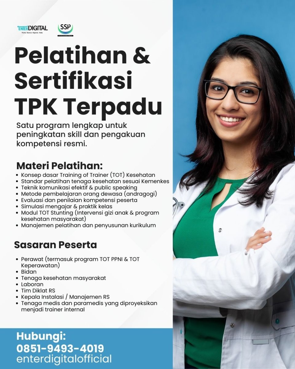 Apakah Anda ingin menjadi tenaga pelatih kesehatan profesional yang diakui secara nasional? Program Sertifikat TPKA menghadirkan pelatihan lengkap bagi tenaga medis, perawat, dan bidan yang ingin mengembangkan kompetensi sebagai trainer. Materi pelatihan mencakup TOT PPI, TOT Keperawatan, dan TOT Kesehatan Jiwa, sehingga peserta mampu membimbing nakes lain dengan metode modern dan standar Kemenkes.