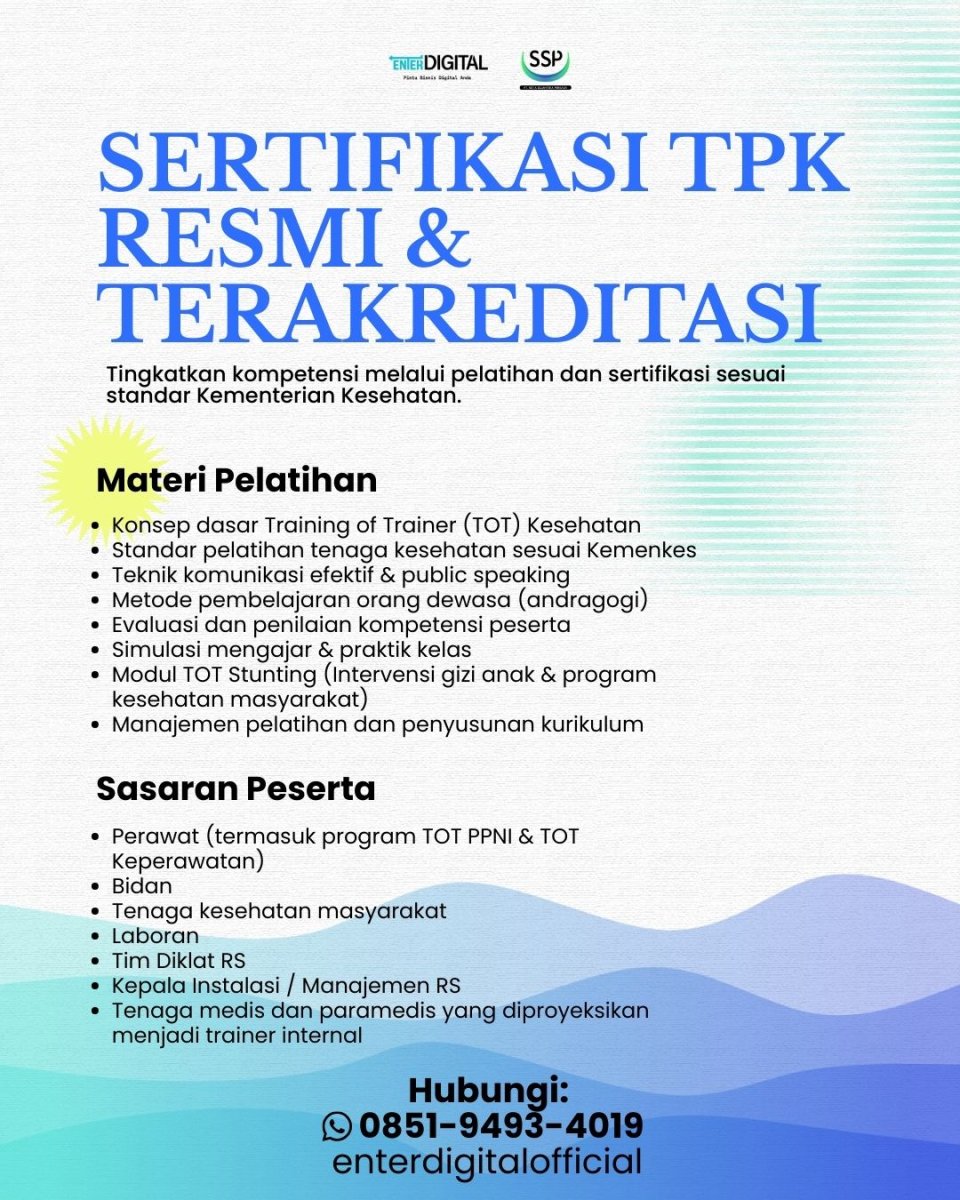 Kini Anda bisa mengikuti sertifikat TPA Online, pelatihan berbasis digital untuk tenaga kesehatan yang ingin meningkatkan kompetensi tanpa harus hadir secara fisik. Program ini mencakup TOT PPIH Kesehatan, TOT Tenaga Kesehatan, dan modul pelatihan tenaga pelatih TPK, sehingga peserta siap menjadi trainer kompeten di fasilitas kesehatan.