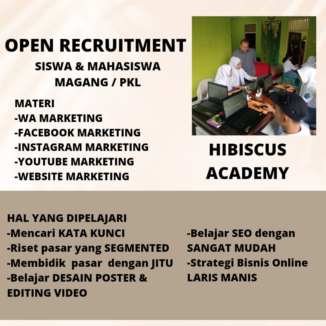 HIBISCUS ACADEMY yang bergerak di bidang internet marketing membuka program magang bagi siswa SMK,dengan berbagai Jurusan seperti: