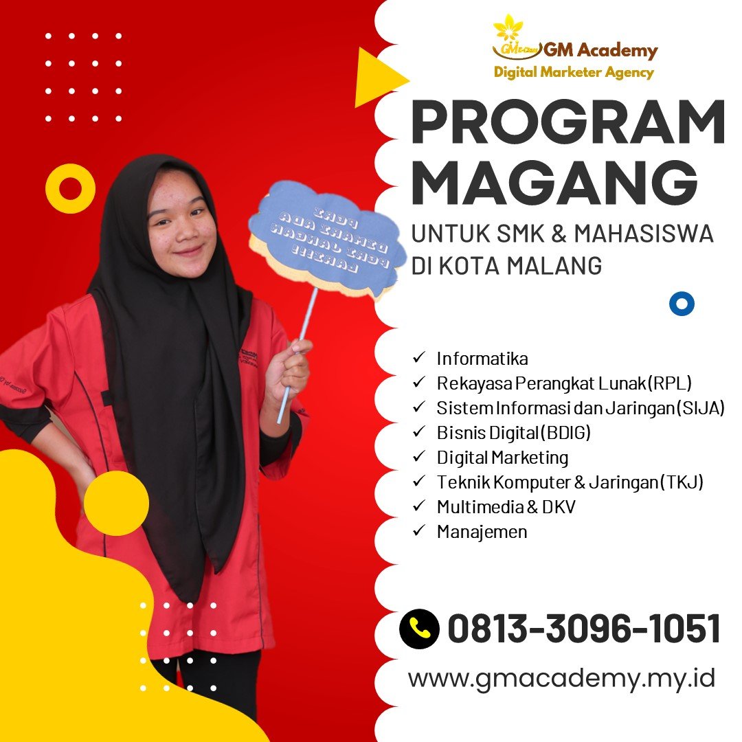 Hubungi 0813-3096-1051, GM Academy adalah Lembaga Pelatihan Digital Marketing di Kota Malang yang membuka Program PKL Mahasiswa Jurusan Sistem Informasi di Malang 2024/2025, Magang Mahasiswa Jurusan Multimedia di Malang 2024/2025, PSG Jurusan TJKT di Malang 2024/2025, Praktek Industri Jurusan Manajemen Informatika di Malang 2024/2025, Magang atau Prakerin, sering disebut juga Internship maupun Praktek Industri atau Praktek Kerja Lapangan/PSG/PKL untuk SMK dan Mahasiswa Jurusan Informatika, RPL, Bisnis Digital, TKJ, SIJA, Multimedia DKV, Sistem Informasi, Digital Marketing atau Pemasaran, Manajemen, dll.