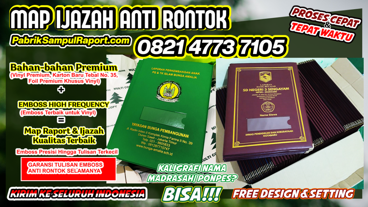 Pabrik Sampul Raport 0 Posted Februari 14, 2024 0821-4773-7105 Map Plastik Raport Sampul Ijazah di Muko-muko Map Plastik Raport Sampul Ijazah di Muko-muko, Harga Map Ijazah Sd Sampul Raport di Muna, Sampul Ijazah Paud Map Raport di Muna Barat, Map Album Ijazah Sampul Raport di Murung Raya, Sampul Plastik Ijazah Map Raport di Musi Banyuasin, Map Ijazah Paud Sampul Raport di Musi Rawas, Hard Cover Raport Map Ijazah di Musi Rawas Utara, Map Seperti Raport Sampul Ijazah di Nabire, Cover Buku Raport Map Ijazah di Nagan Raya, Map Raport Paud Sampul Ijazah di Nagekeo Jembar Jaya Mandiri adalah perusahaan produksi (cetak) sampul map ijazah / sampul raport dengan sekala besar, kami telah menggunakan mesin cetak sekala pabrik dan juga memiliki tenaga kerja ahli, terampil dan profesional di bidangnya.Jembar Jaya Mandiri Melayani Cetak Sampul Raport dan MAP Ijazah, Harga Murah untuk sekolah TK, SD, SMP, SMK, SMA, Universitas, Pondok Pesantren dan Madrasah.Siap kirim ke seluruh wilayah Indonesia. Spek : - Bahan : - ASE grade 1 - Karton baru ketebalan 35 - Foil Emas Premium - Garansi Anti Rontok Seumur Hidup - Gratis desain tulisan Arab kaligrafi untuk nama yayasan pondok pesantren dan Madrasah. Kami berupaya menjadi percetakan map terbaik dalam hal kualitas produk dan pelayanan terhadap semua customer di wilayah Indonesia.Buat Map ijazah dan sampul raport di Jembar Jaya Mandiri lebih mudah, murah, aman, cepat dan terpercaya! Kami berupaya menjadi percetakan map terbaik dalam hal kualitas produk dan pelayanan terhadap semua customer di wilayah Indonesia. Bisa Custom : -Keling sudut -Logo berwarna -Resleting -Tambah demensi tebal -Tambah pita (penjepit Ijazah) -Emboss halaman belakang -Tambah Bludri (inner map) Kontak Kami : 0821-4773-7105 Atau bisa langsung klik link wa admin kami di https://bit.ly/ADMINJEMBARJAYAMANDIRI Kunjungi website resmi kami https://pabriksampulraport.com Quote Share this post Link to post Share on other sites