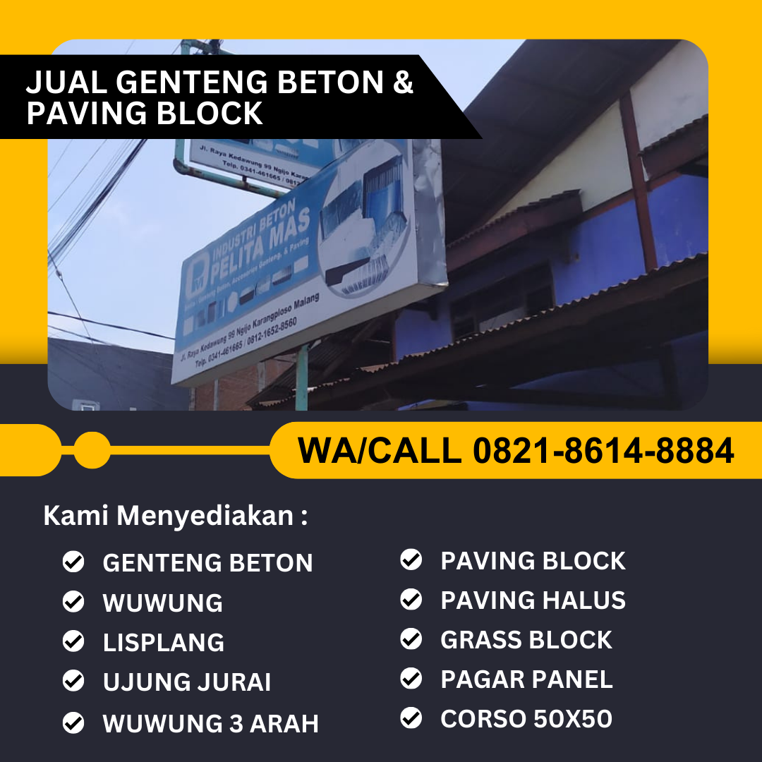 Genteng flat untuk Rumah minimalis 0 Posted Mei 3, 2024 PESAN https://wa.me/6282186148884 , Pelita Mas adalah perusahaan yang bergerak di bidang Industri Beton dan Paving Block. Genteng Anti Berisik, Genteng Anti Panas, Genteng Anti Pecah, Genteng Atap, Genteng Atap Datar. Distributor Genteng Minimalis Hitam menyediakan solusi elegan untuk atap modern Anda. Dengan desain yang simpel namun menawan, genteng ini memberikan sentuhan minimalis yang mempercantik struktur bangunan. Kualitas tinggi dan tahan lama, genteng hitam ini tersedia melalui distributor kami. Kami melayani pengiriman ke berbagai kota diantaranya Malang, Sidoarjo, Pasuruan, Surabaya, Gresik, Lamongan, Mojokerto, Madura, Probolinggo, Banyuwangi, Kediri, Blitar, Jombang, Madiun, Nganjuk, area jawa timur dan pengiriman luar jawa untuk daerah Indonesia Timur seperti Sulawesi, Bali, NTT, NTB, dan Papua. Produk yang kami produksi terdiri dari : 1. Genteng Beton Multiline 2. Genteng Beton Urat Batu 3. Genteng Beton Royal 4. Genteng Beton Vertical 5. Wuwung Genteng 6. Paving ukuran 20x20, 10,5x21, Diagonal 7. Kanstin dan Topi Uskup 8. Pagar Panel 9. Paving Corso 50x50 10. Paving Grass Block Lubang Untuk informasi lebih lanjut serta pemesanan, hubungi : UD Pelita Mas Jl. Raya Kedawung No 99, Ngijo, Kec. Karangploso, Kab. Malang, Jawa Timur, 65152 (200 Meter Dari Swalayan enak eco) Hub kami via whatsapp https://wa.me/6282186148884 Hub kami via whatsapp https://wa.me/6282186148884 Official account : Map : https://maps.app.goo.gl/MTqcxUXZsusTUsBFA Website : www.jualgentengbeton.com Instagram : https://www.instagram.com/pelitamasofficial Tiktok : https://vt.tiktok.com/ZSdvDaBN8/ Facebook : https://www.facebook.com/gentengflatbeton/ Quote Share this post Link to post Share on other sites