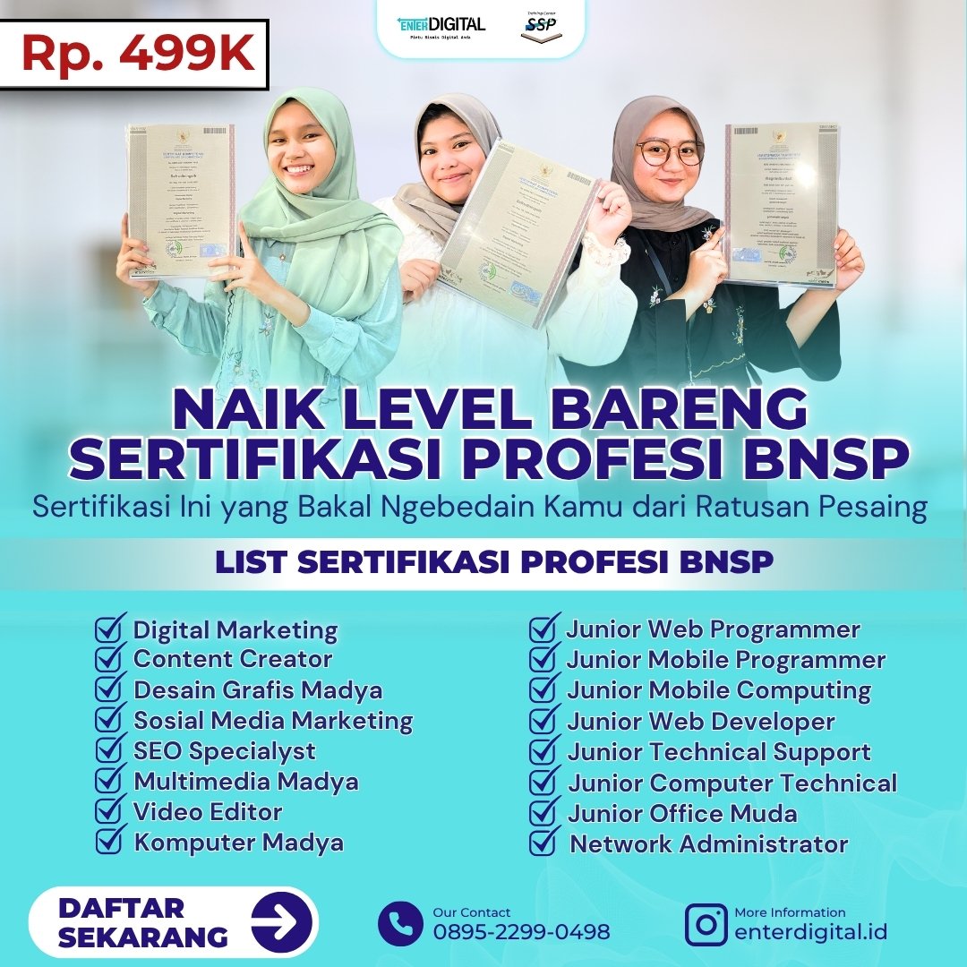 Sertifikasi ini merupakan pengakuan profesional atas keterampilan Anda dalam bidang desain grafis, dikeluarkan langsung oleh Badan Nasional Sertifikasi Profesi (BNSP). Dengan sertifikasi ini, Anda tidak hanya diakui secara hukum, tapi juga dipercaya oleh klien, perusahaan, dan industri kreatif.